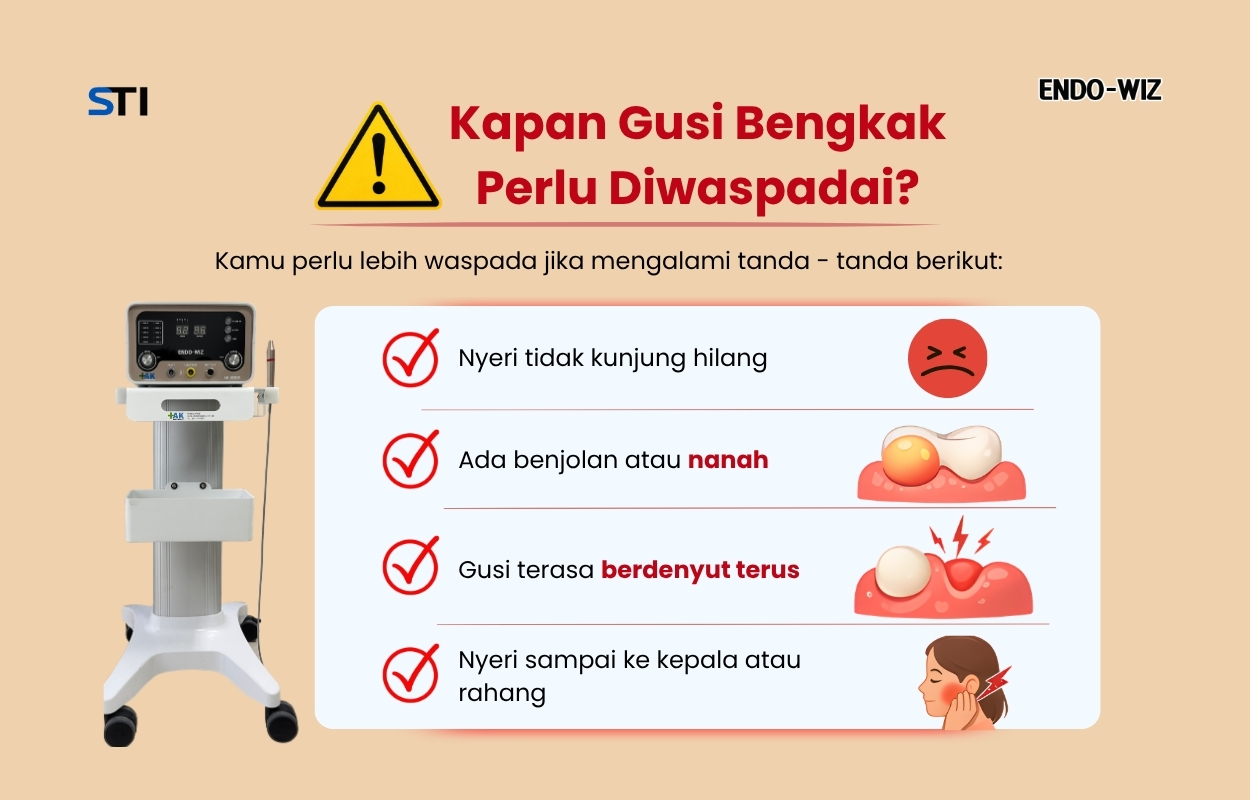 Jika gusi bengkak disebabkan oleh infeksi atau abses, diperlukan penanganan profesional. Dokter gigi mungkin akan melakukan pembersihan, penambalan, atau perawatan saluran akar jika infeksi sudah mencapai bagian dalam gigi. Perawatan saluran akar kini sudah lebih nyaman dan aman dengan bantuan alat Endo-Wiz. Melalui Endo-Wiz, perawatan bisa lebih akurat, nyaman, dan juga cepat. Sehingga sumber masalah akan tuntas sepenuhnya walau hanya satu kali kunjungan.