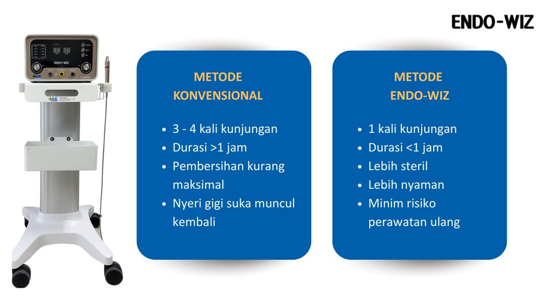 Endo-Wiz merupakan alat perawatan saluran akar yang digunakan oleh dokter gigi dengan proses perawatan lebih cepat dan terarah. Perawatan saluran akar dengan Endo-Wiz memiliki keuntungan untuk pasien, antara lain: