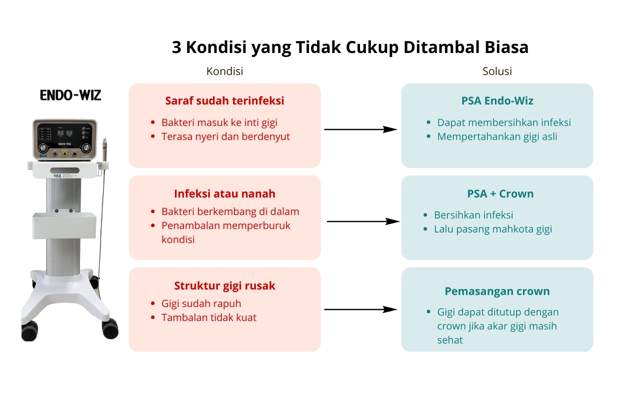 Jangan tunggu sampai gigi semakin parah. Segera konsultasikan ke dokter gigi dan tanyakan tentang perawatan dengan dukungan teknologi Endo-Wiz.